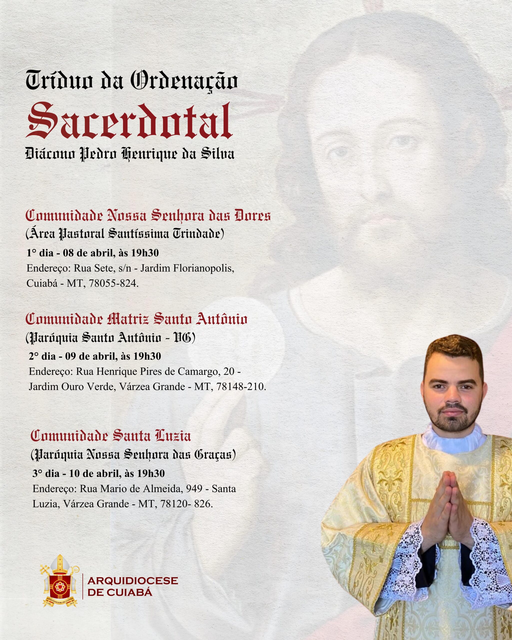 A Arquidiocese de Cuiabá divulgou a programação do Tríduo de Ordenação Sacerdotal do diácono Pedro Henrique da Silva, que será realizado entre os dias