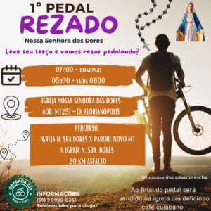 Ainda no dia 07/09 – feriado nacional, membros da comunidade vão participar, pela primeira vez, de um pedal rezado. A saída será às 6h, da comunidade no bairro Jd. Florianópolis, em direção ao Parque Novo Mato Grosso. Em seguida, retornam para um café da manhã, na comunidade. O Chá com bolo será vendido para os participantes do pedal que, a noite, também participam da novena.