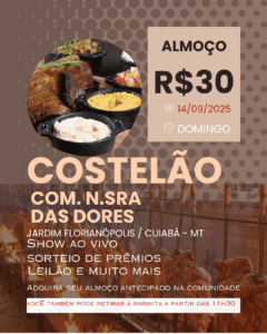 No mesmo dia, às 11h30, será servido o almoço, no valor de R$30, para que todos possam celebrar a padroeira da comunidade, Nossa Senhora das Dores.O tickt pode ser adquirido no balcão do dízimo durante a semana, na comunidade, ou aos final de semana, durante a celebração da Santa Missa. O cardápio será costelão, bem servido, com arroz, farofa e salada, e há a opção de retirada para aqueles que desejam almoçar em suas casas. Neste ano, o que a comunidade espera, é que os participantes estejam presente para comer a vontade, o costelão da padroeira, com direito a participar do sorteio de brindes, ouvir boa música com a presença de bandas locais e conferir as apresentações das crianças da comunidade.