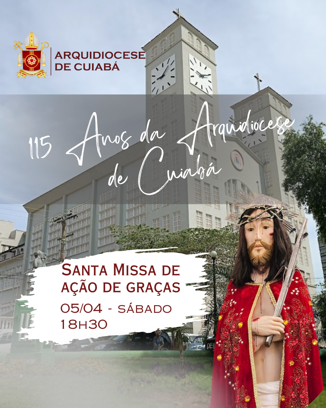 No dia 5 de abril de 2025, a Arquidiocese de Cuiabá vai celebrar 115 anos de sua elevação a arquidiocese, marcando uma história de evangelização, compromisso pastoral e também de crescimento da Igreja em Mato Grosso. Os fiéis da Arquidiocese de Cuiabá são convidados a participar da Celebração da Santa Missa de Ação de Graças, que será presidida por Dom Mário Antonio, arcebispo metropolitano, no próximo sábado, na Catedral Senhor Bom Jesus de Cuiabá, às 18h30.