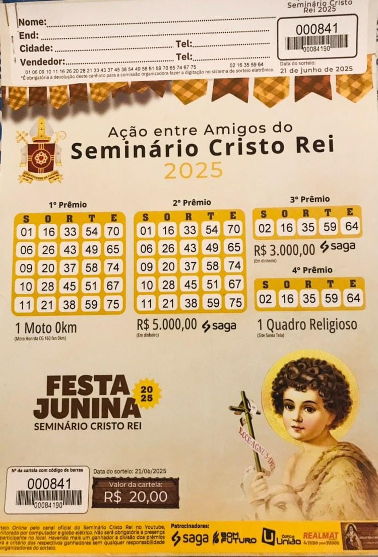 Por apenas R$ 20,00, você colabora com a formação dos futuros sacerdotes da Arquidiocese de Cuiabá e ainda concorre a prêmios incríveis: