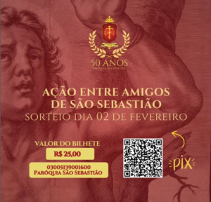 Para celebrar com toda a comunidade, a Paróquia São Sebastião, neste ano, fará o sorteio de 50 prêmios! Pela primeira vez, serão realizados sorteios e todos podem participar. O primeiro prêmio é o valor de R$1000, os demais 49 prêmios, valores de R$500. Aqueles que desejam participar podem adquirir seu bilhete pelo PIX da Paróquia: 03005139001600, por apenas R$25.