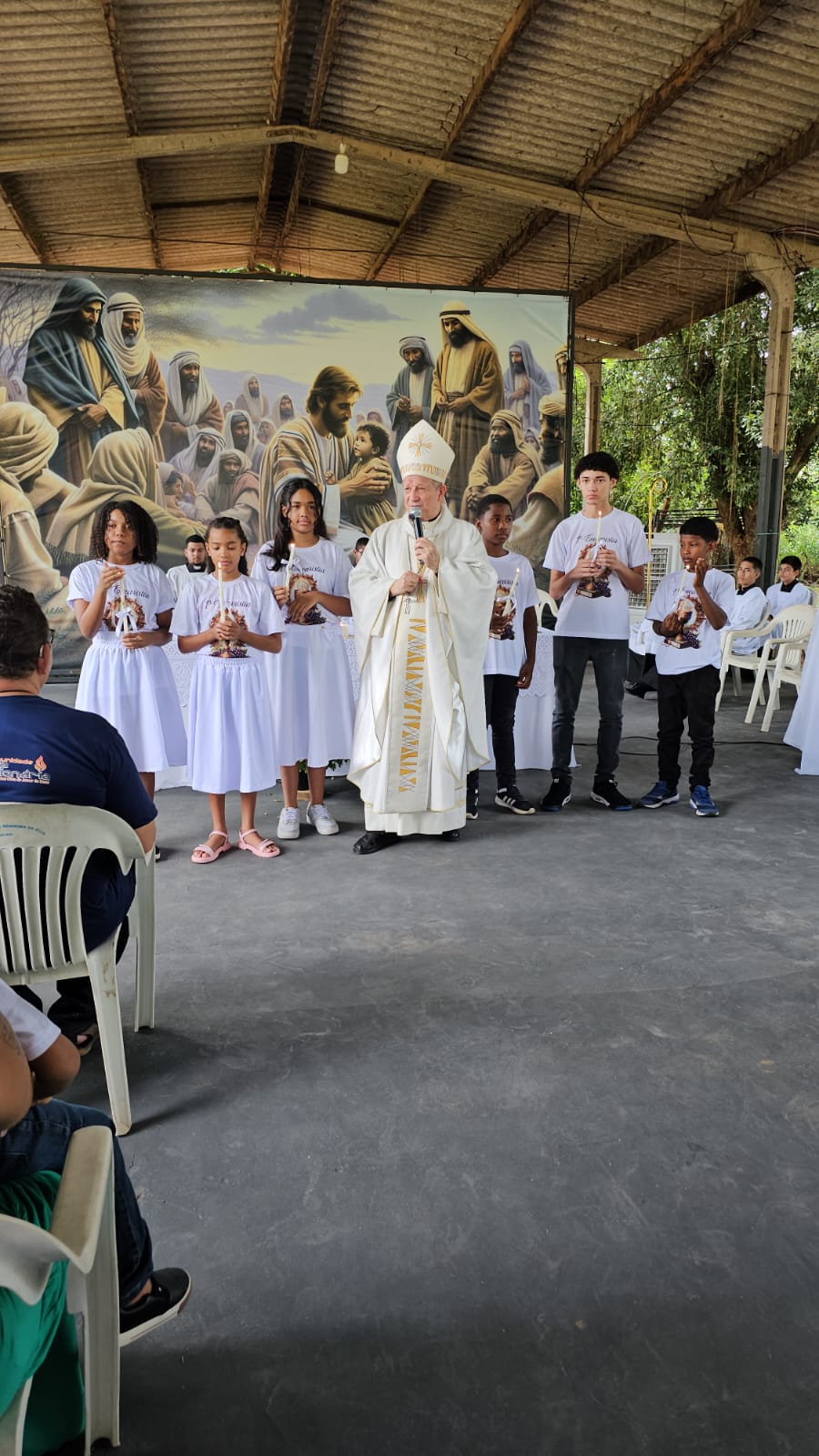 Dom Mário também realizou o rito de celebração da Primeira Comunhão de seis adolescentes acompanhados pela comunidade. Além disso, Dom Mário almoçou com a comunidade, participou das homenagens prestadas e conheceu de perto os trabalhos que são realizados com as famílias da comunidade.