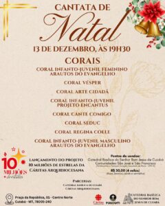 A Catedral Basílica Senhor Bom Jesus de Cuiabá, no centro da capital, conta com apresentação da tradicional Cantata Natalina, no próximo dia 13, às 19h30. Uma parceria com a Cáritas Arquidiocesana que poderá ser apreciada pelos fiéis e toda comunidade. As apresentações previstas são: Coral Infanto-juvenil Feminino Arautos do Evangelho, Coral Vésper, Coral Infanto Juvenil Projeto Hencantus, Coral Seduc, Coral Regina Coeli e Coral Infanto-Juvenil Masculino Arautos do Evangelho. Para prestigiar esse momento você precisa levar apenas 1 quilo de alimento não perecível. Os alimentos arrecadados serão destinados às pessoas que mais necessitam. A Catedral também está vendendo velas para a Campanha 10 Milhões de Estrelas no valor de R$ 30.