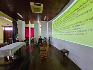 O segundo momento da manhã, não menos importante, foi conduzido Marilza Schuina, membro da Comissão Episcopal para o Laicato e assessora voluntária da CEBs, falou sobre o caminho do Sínodo sobre a Sinodalidade na Igreja. Ela nos lembrou sobre o nosso propósito, nesses dias, é de seguir o caminhar juntos, com pesquisas, escutas e atenção.