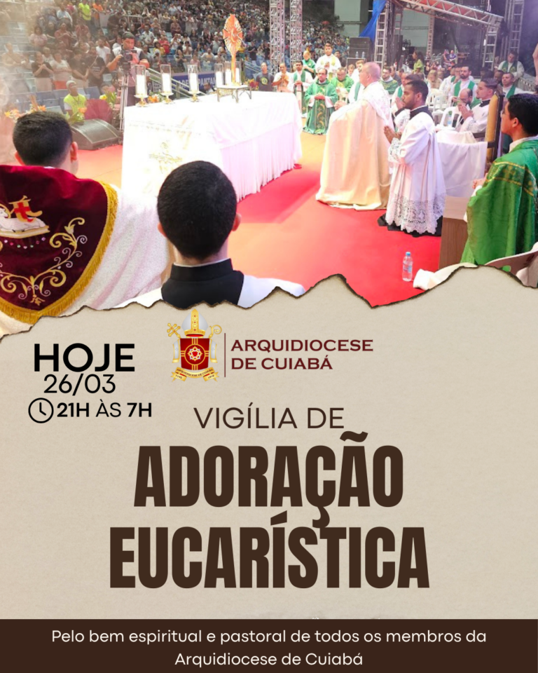 26 de março de 2025 Vigília de Adoração Eucarística terá 10 horas de oração ininterrupta Os padres e diáconos da Arquidiocese de Cuiabá, que estão reunidos em Aparecida no Retiro anual do Clero, se preparam para iniciar uma Vigília
