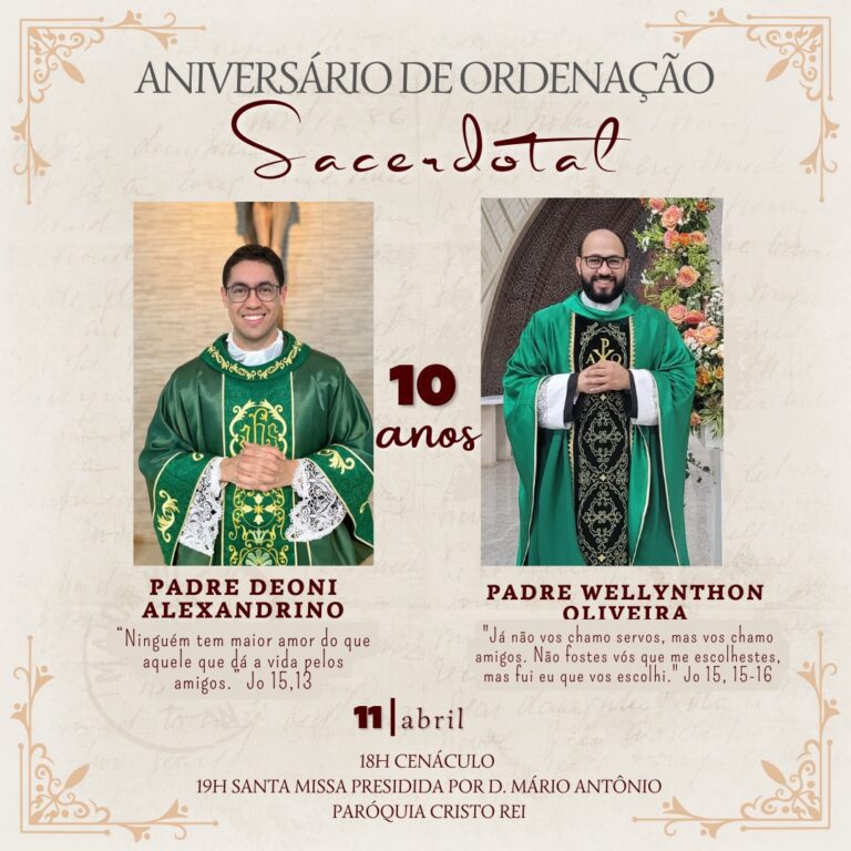 9 de abril de 2025 Dom Mário presidirá celebração de 10 anos de sacerdócio de padres da Arquidiocese O Arcebispo de Cuiabá, Dom Mário Antonio, presidirá, na próxima sexta-feira (11), a Santa Missa de Ação de Graças pelos 10 de anos de