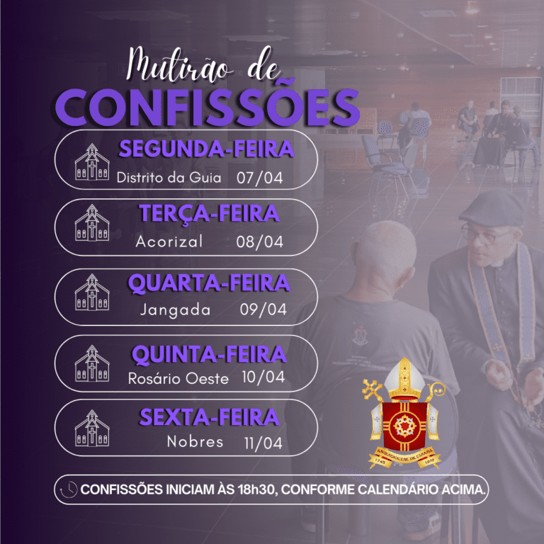 4 de abril de 2025 Mutirão de Confissão é realizado em paróquias da Região Norte Nossos padres da Região Norte da Arquidiocese de Cuiabá se uniram, e na próxima semana, inicia o mutirão de confissão para as cidades de: