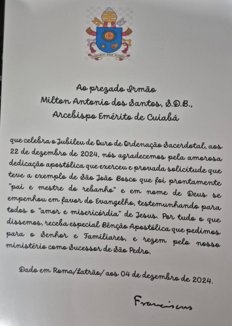 7 de janeiro de 2025 Papa Francisco envia carta e bênção apostólica para Dom Milton Santos Em um gesto de profunda comunhão e apreço, o Papa Francisco enviou uma carta celebrativa, destinada ao arcebispo emérito de Cuiabá, Dom Milton Antonio