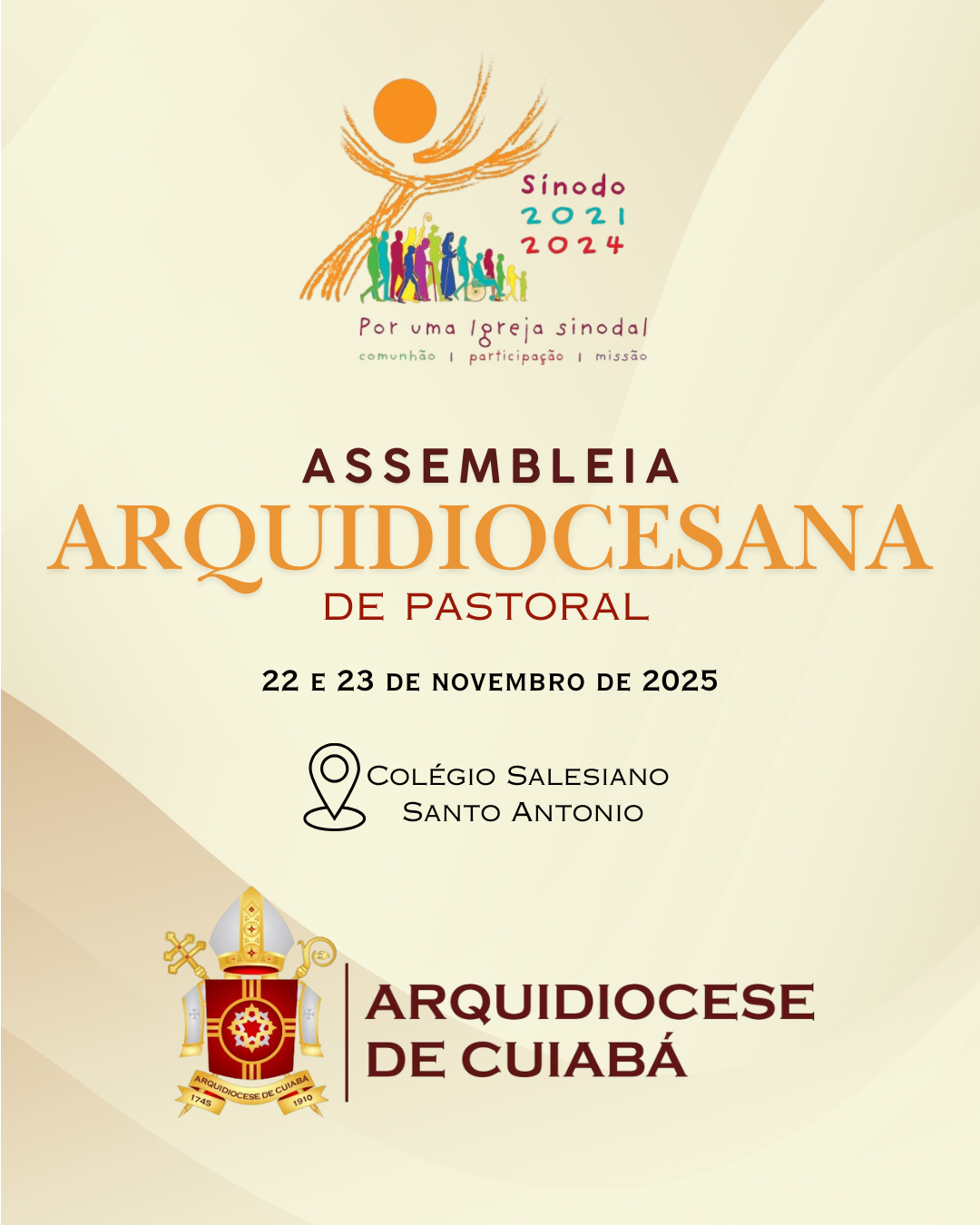 A Arquidiocese de Cuiabá realizará, nos dias 22 e 23 de novembro de 2025, a sua Assembleia Arquidiocesana de Pastoral, um encontro que pretende reunir todo o corpo eclesial em um processo de discernimento e planejamento para os próximos anos. A convocação foi feita pelo arcebispo metropolitano, Dom Mário Antonio da Silva, reforçando a importância da participação ativa de cada vocação e serviço eclesial.