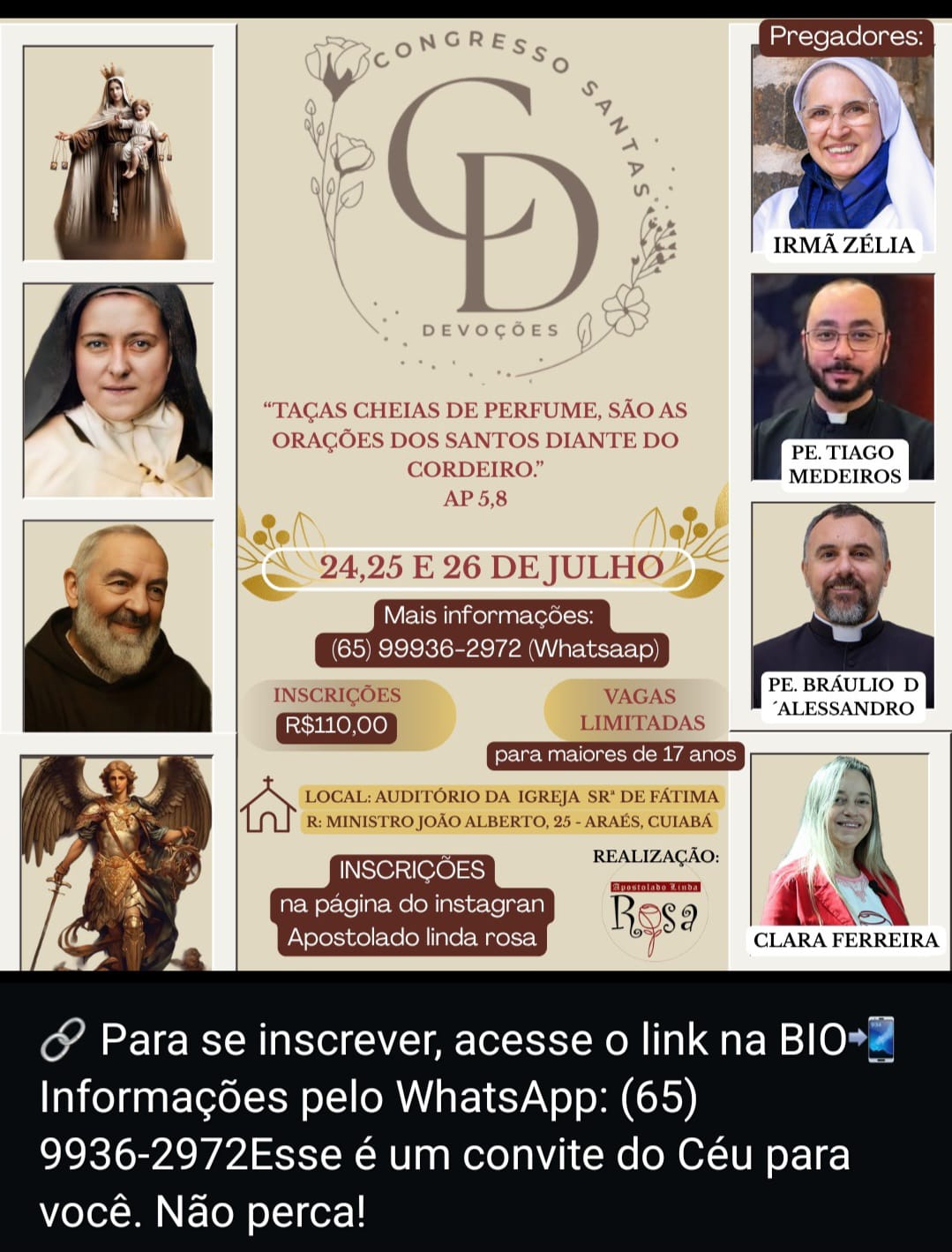 Nos dias 24, 25 e 26 de julho, o auditório da Capela Nossa Senhora de Fátima, no Bairro Araés, em Cuiabá (MT), receberá um encontro de espiritualidade voltado à oração, adoração e aprofundamento na fé.
