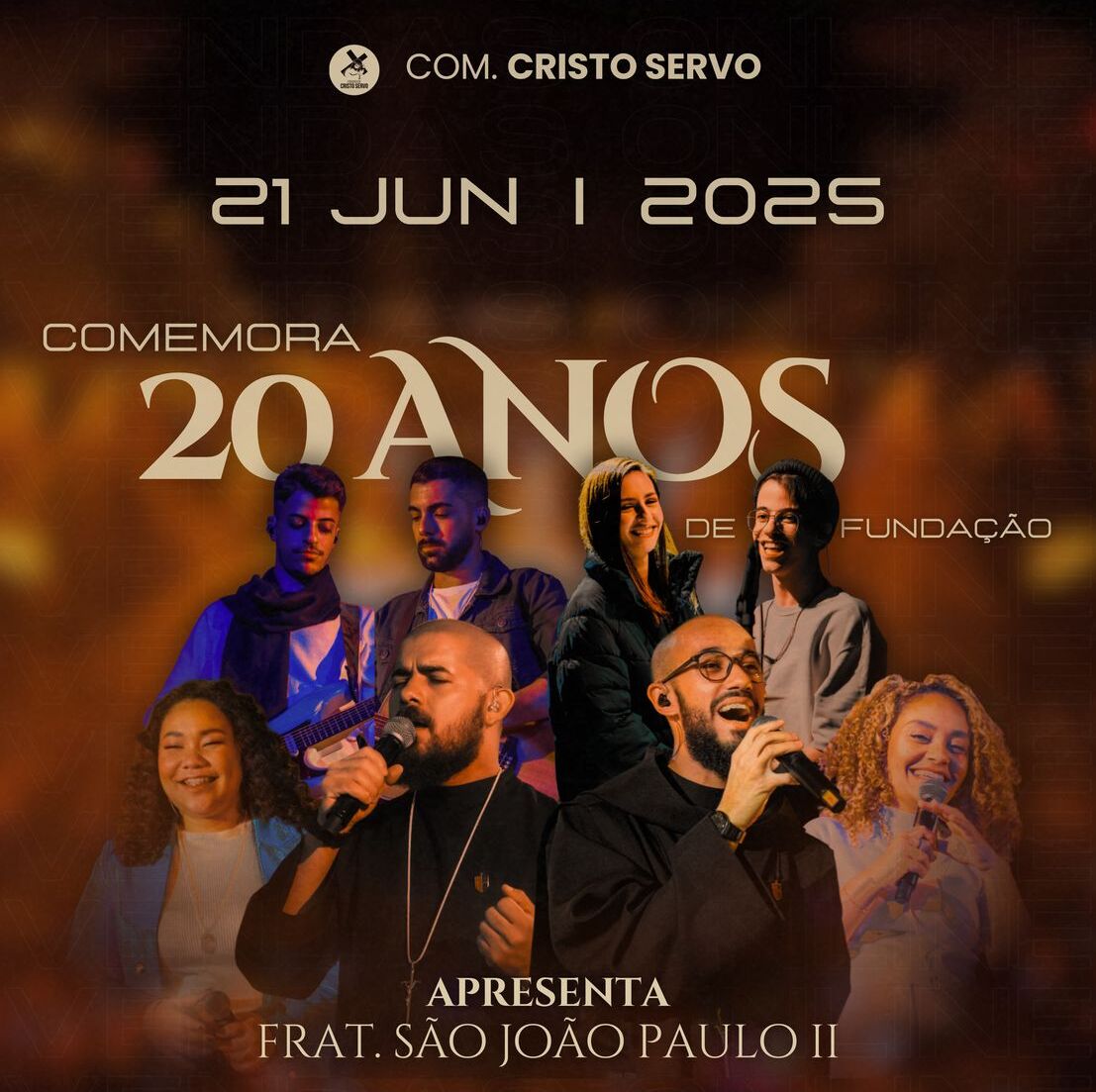 A Comunidade Católica Cristo Servo celebra 20 anos de missão evangelizadora com um show nacional da Fraternidade São João Paulo II, no dia 21 de junho, às 19h, em Várzea Grande. A apresentação será no Centro Pastoral Padre Aldacir Carniel (Cepac), ao lado da Igreja Nossa Senhora do Carmo.
