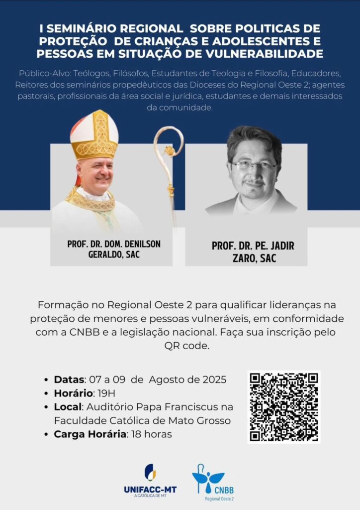 Entre os dias 7 e 9 de agosto de 2025, a Faculdade Católica de Mato Grosso (Unifacc MT) sediará o I Seminário Regional sobre Políticas de Proteção de Crianças, Adolescentes e Pessoas em Situação de Vulnerabilidade. A formação acontecerá no Auditório Papa Franciscus, com carga horária de 18 horas e início das atividades previsto […]