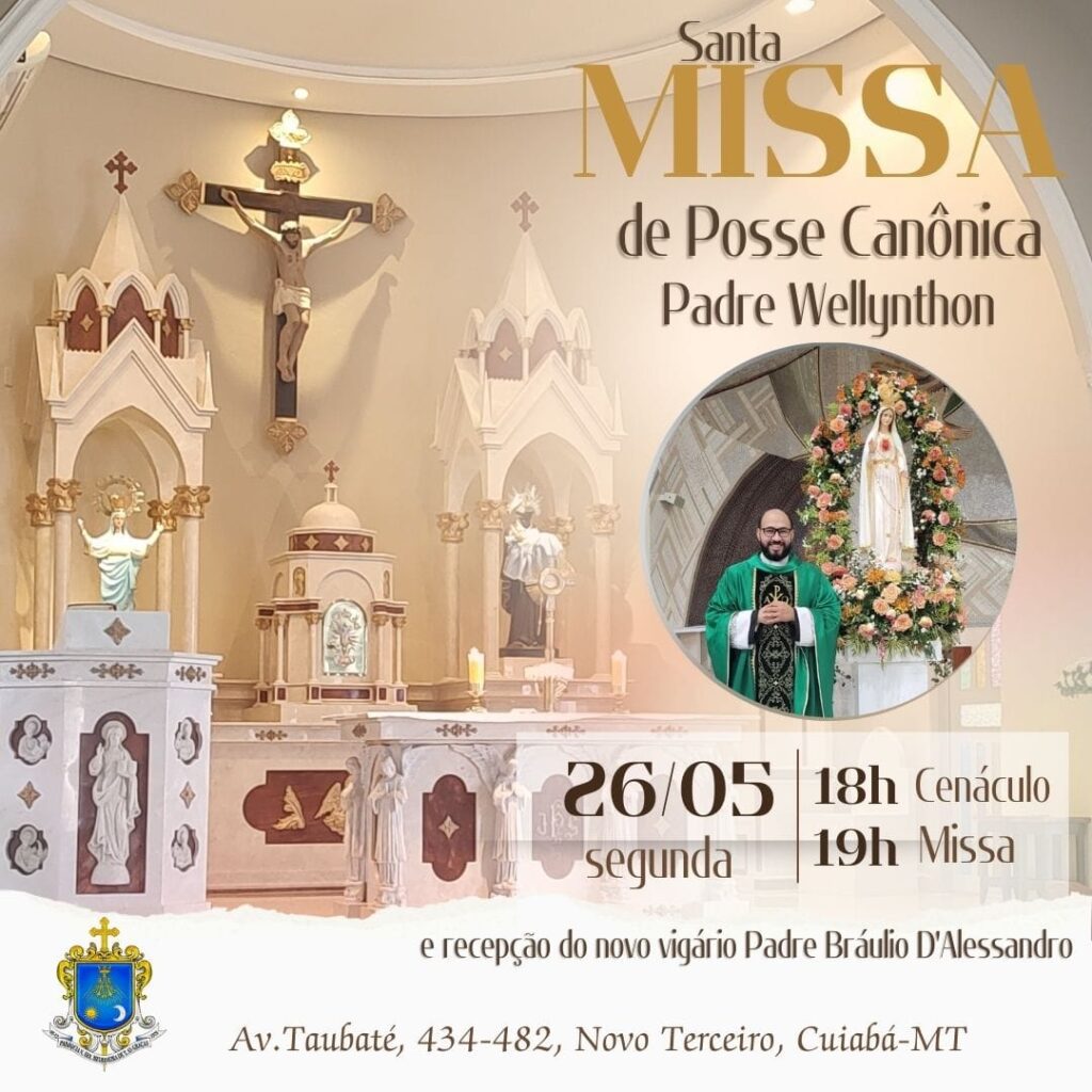 Na noite de hoje (26), o padre Wellynthon Jonny será empossado, pelo arcebispo de Cuiabá, Dom Mário Antonio, pároco da Paróquia Nossa Senhora Medianeira de Todas as Graças. A solenidade está marcada para às 19h, na Igreja Matriz, localizada na Avenida Taubaté, 434 – 482, no bairro Novo Terceiro, em Cuiabá. Também será realizada a […]