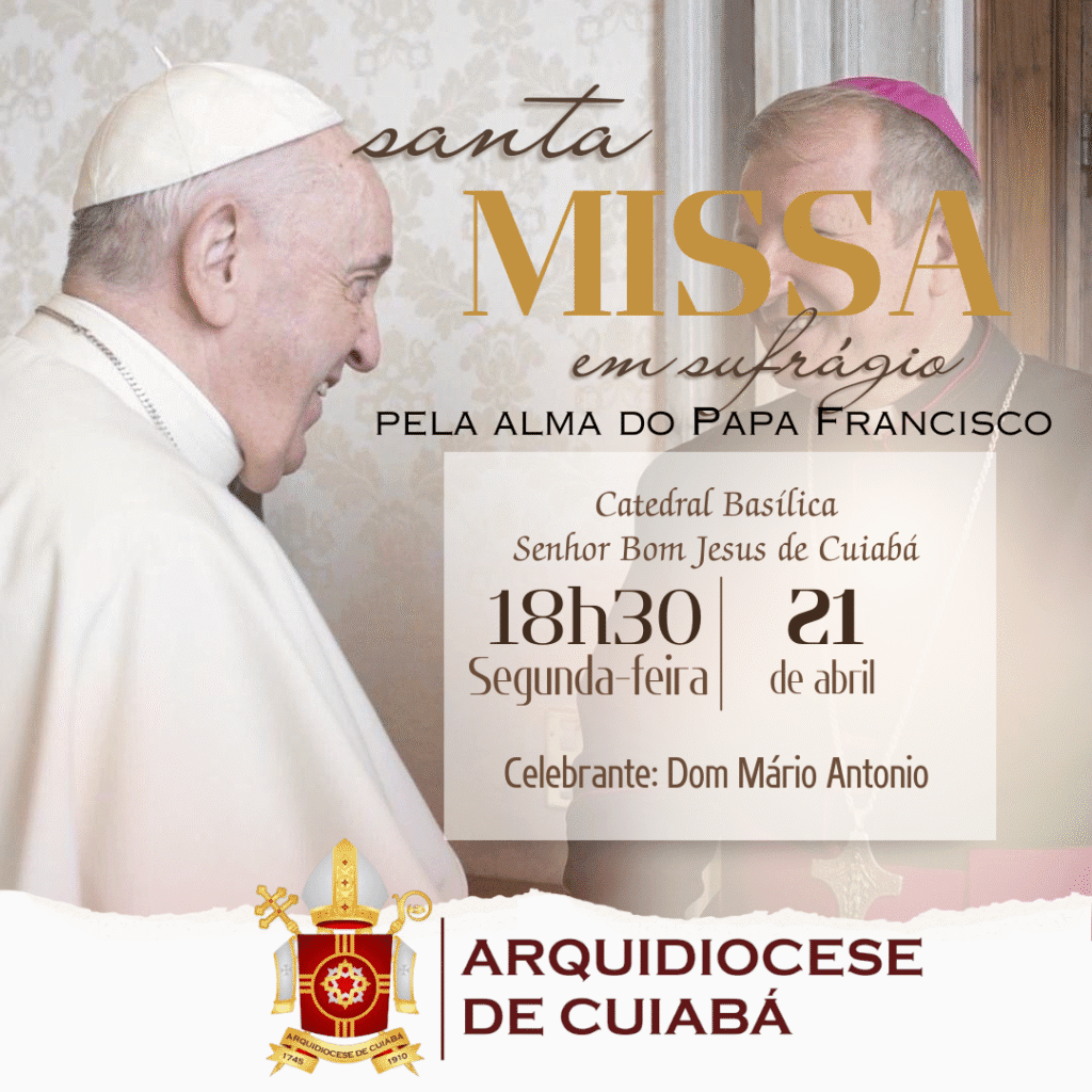 Nesta segunda-feira, 21 de abril de 2025, a Arquidiocese de Cuiabá foi surpreendida pela notícia do falecimento do Papa Francisco. Os fiéis, leigos e leigas, são convidados para a missa em sufrágio pela alma do Papa, que será celebrada às 18h30, na Catedral Basílica Senhor Bom Jesus de Cuiabá, no centro da capital mato-grossense. A […]