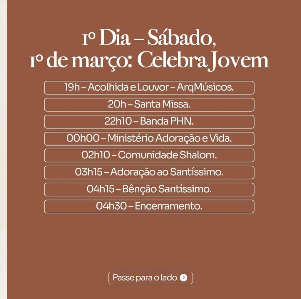 A segunda-feira de Carnaval em Cuiabá é sempre muito emocionante para aqueles que acompanham o Vinde e Vede. Isso porque o dia é dedicado a Nossa Senhora e há um Grande Cenáculo Mariano sendo preparado para este dia 3 de março, na Arena Pantanal. A programação do Vinde e Vede, no seu terceiro dia, é […]