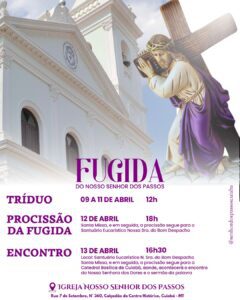 A tradicional celebração da Missa da Fugida, realizada em Cuiabá, será realizada hoje (12), na Igreja Senhor dos Passos, próximo ao Beco do Candieiro, no centro da capital. A Santa Missa, seguida de procissão, será presidida por Dom Mário Antonio, arcebispo de Cuiabá, e concelebrada por padres da arquidiocese. Esta celebração marca o início da Semana Santa. O termo “Fugida do Senhor” está associado a episódios que encontramos nas leituras das celebrações nesses últimos dias.